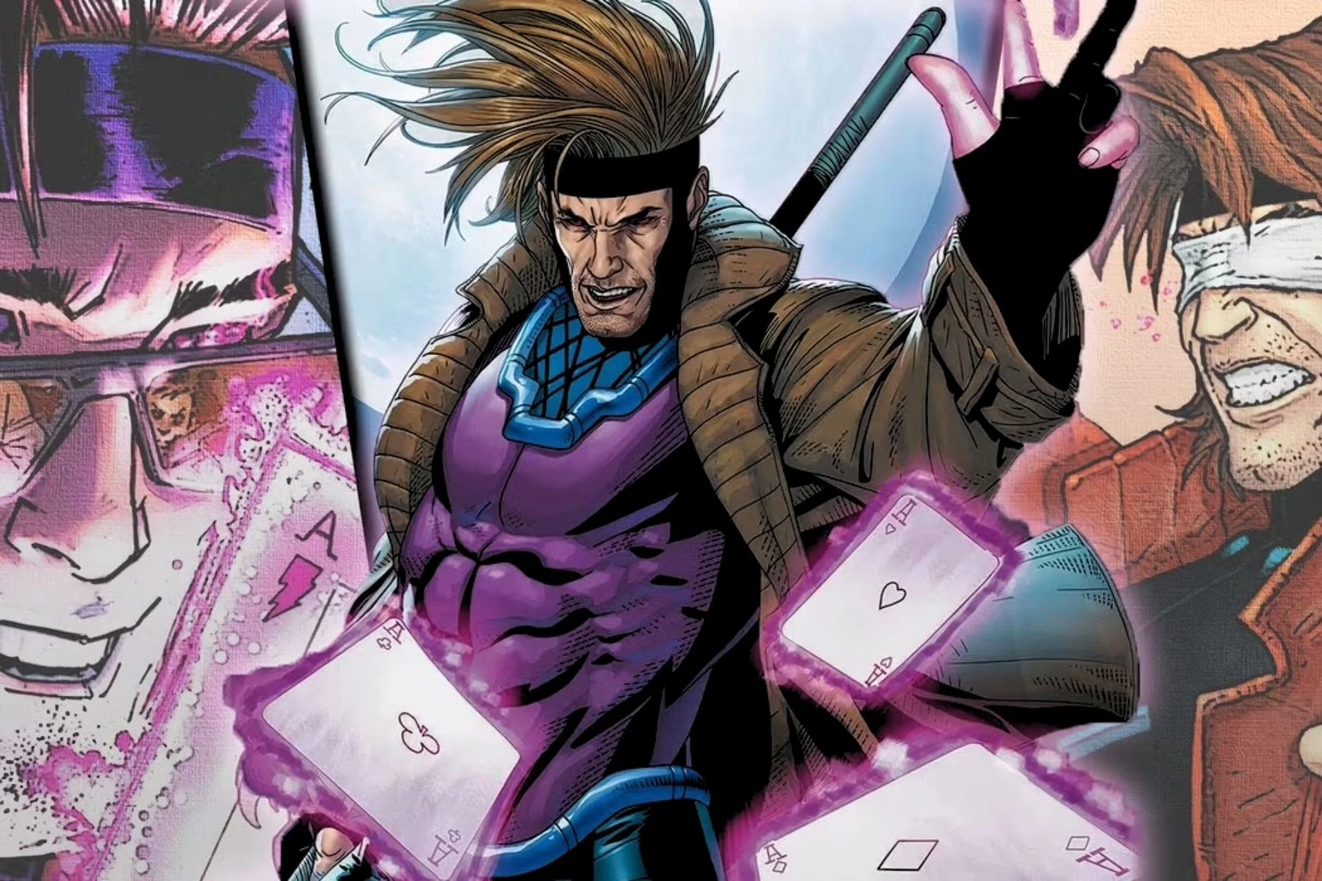 Gambit lunges forward in trench coat with swirling cape and pink energy burst background.